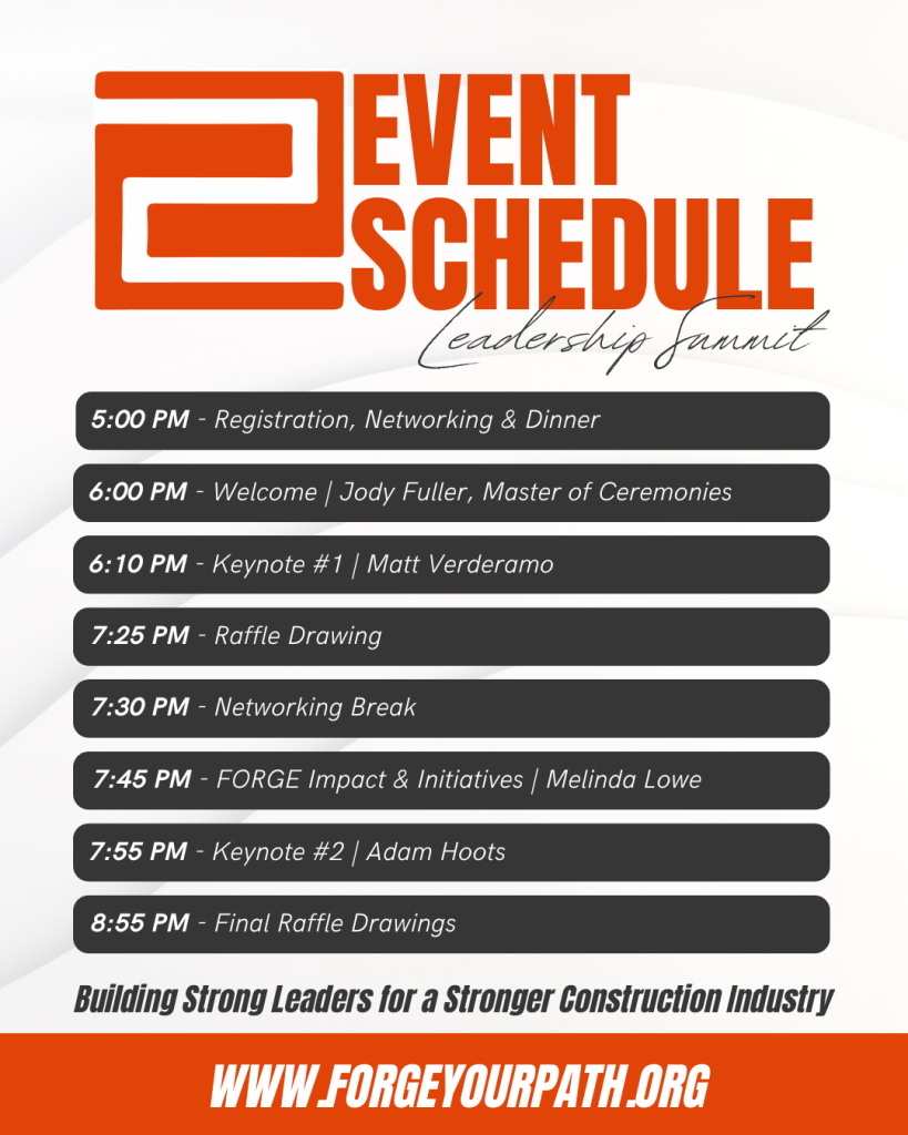 Click below to access the registration form and secure your table, half table, seat, or workshop add-on for the 2026 FORGE Ahead Construction Leadership Summit.